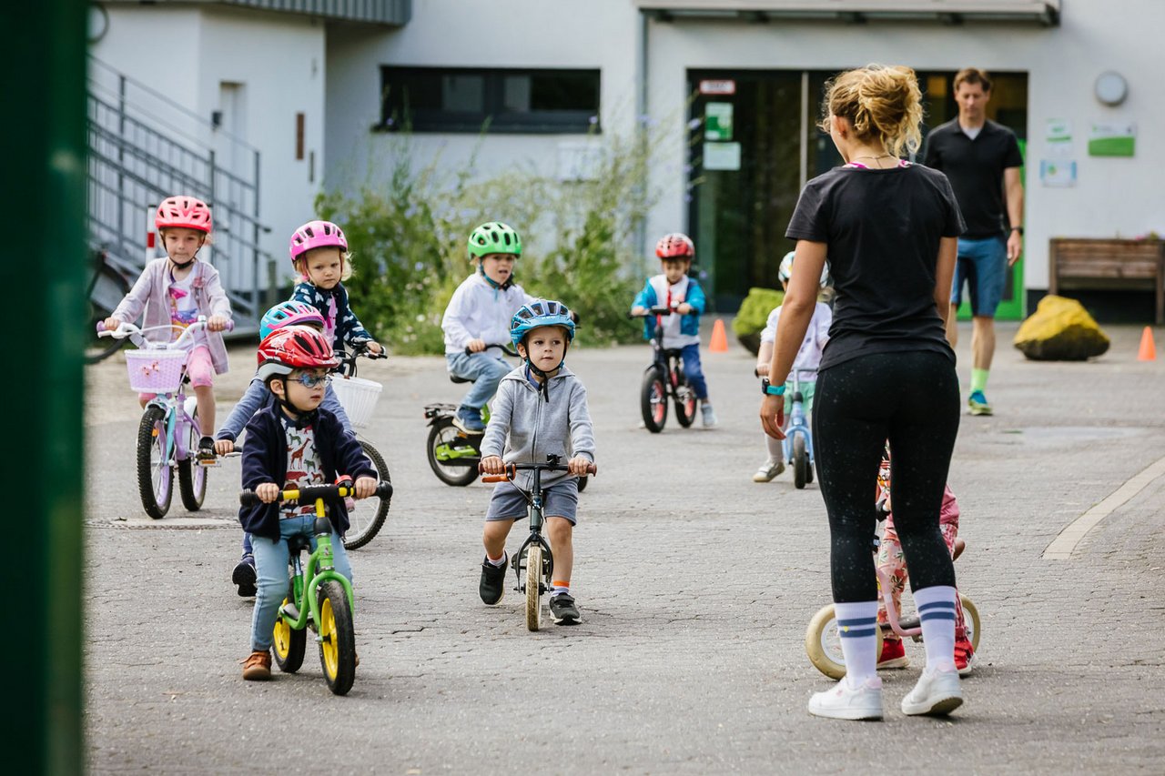Die Kinder fahren durcheinander und der/die Erzieher*in versucht Kinder langsamen Schrittes zu fangen.